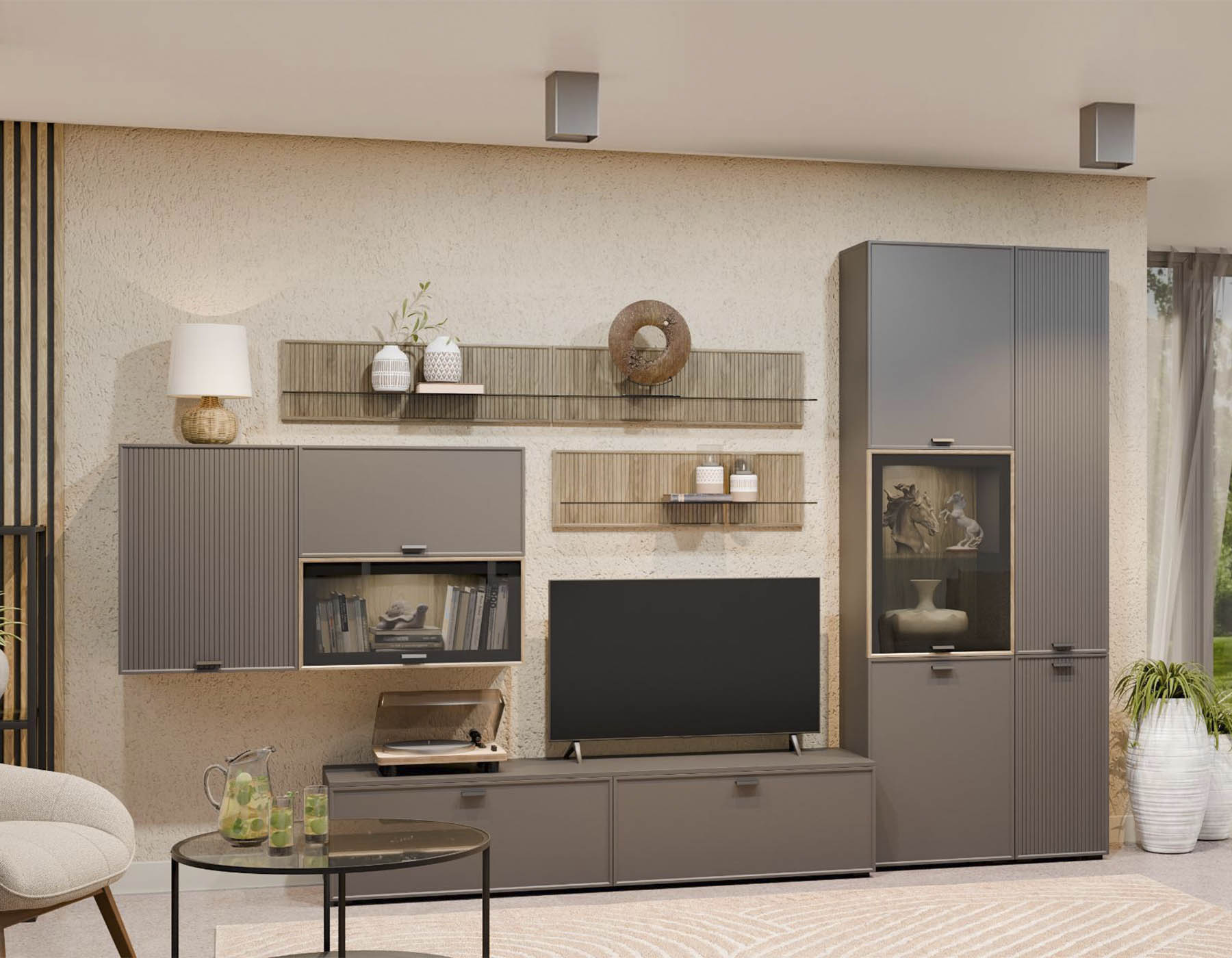 - Функциональные модули: шкаф, ТВ-тумба, полки и навесные секции