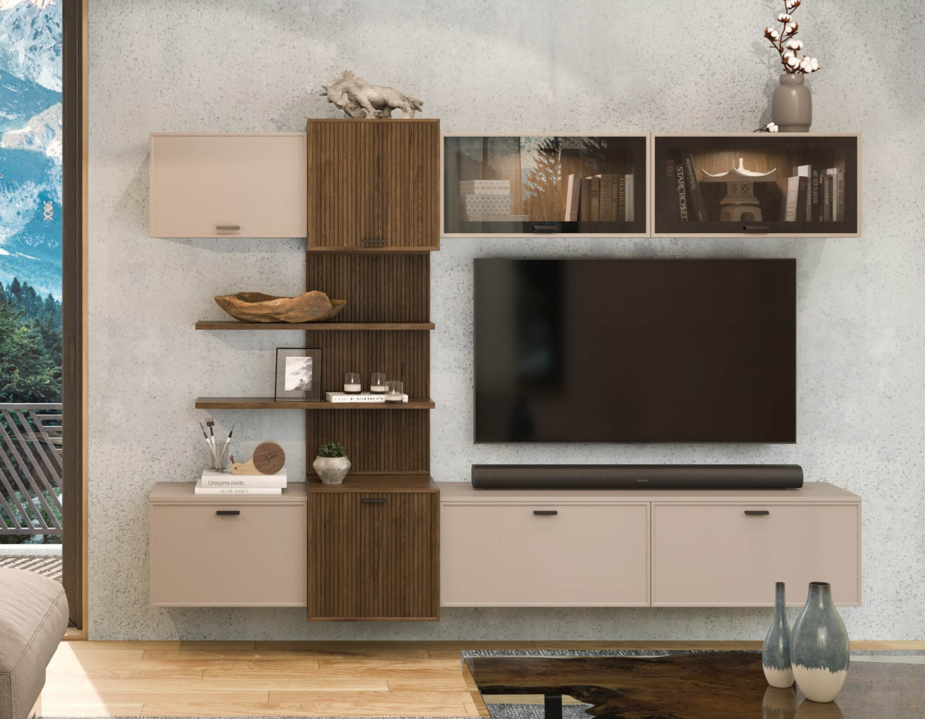 - Функциональная ТВ-тумба с вместительными закрытыми секциями