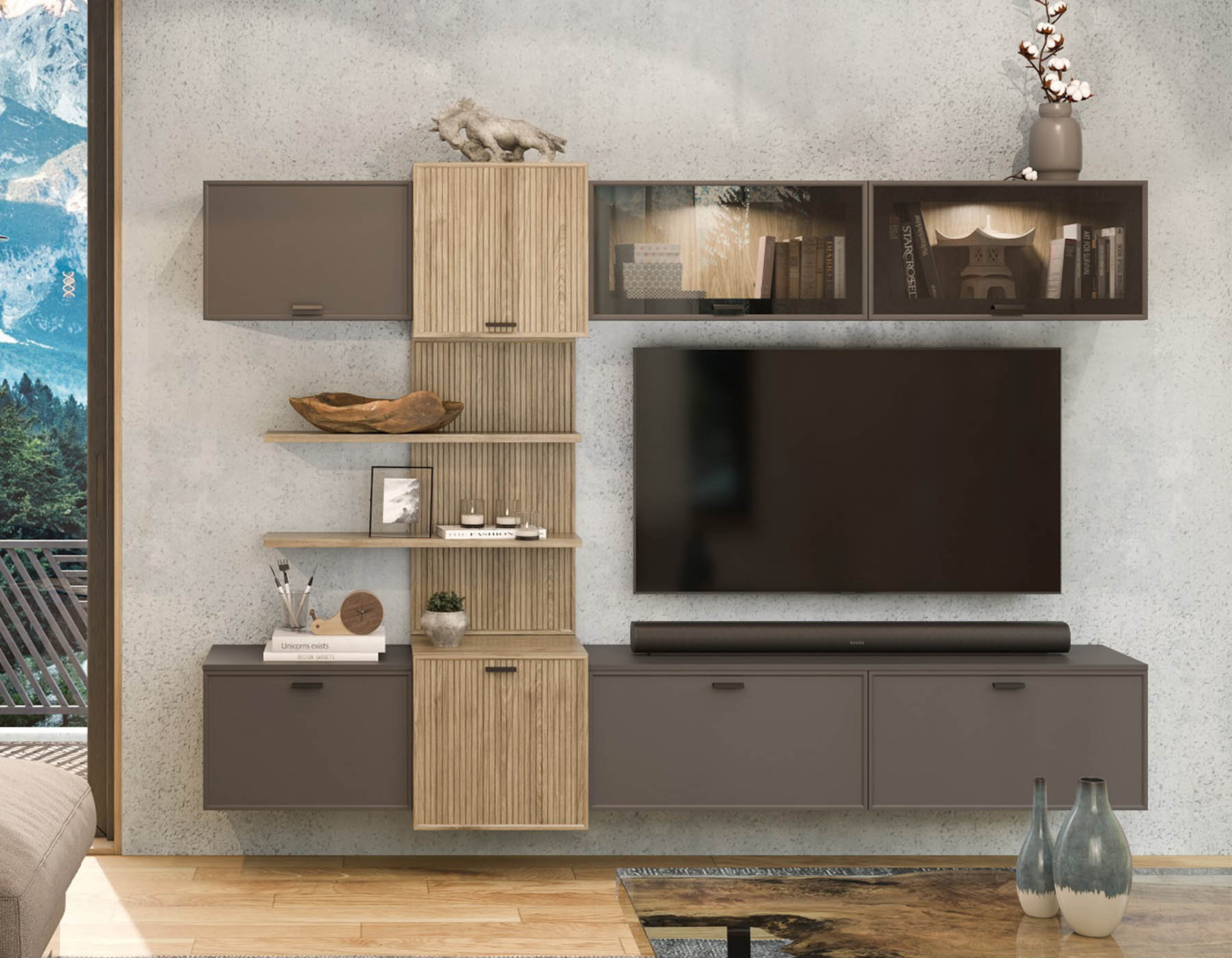 - Функциональная ТВ-тумба с вместительными закрытыми секциями