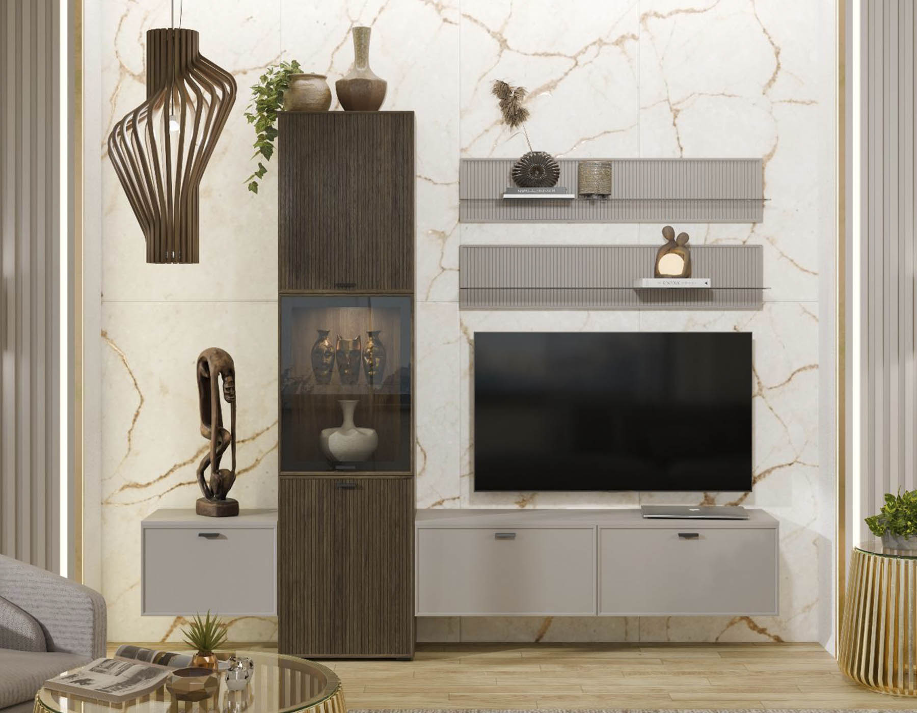 - Функциональность: шкаф-витрина, ТВ-тумба и полки