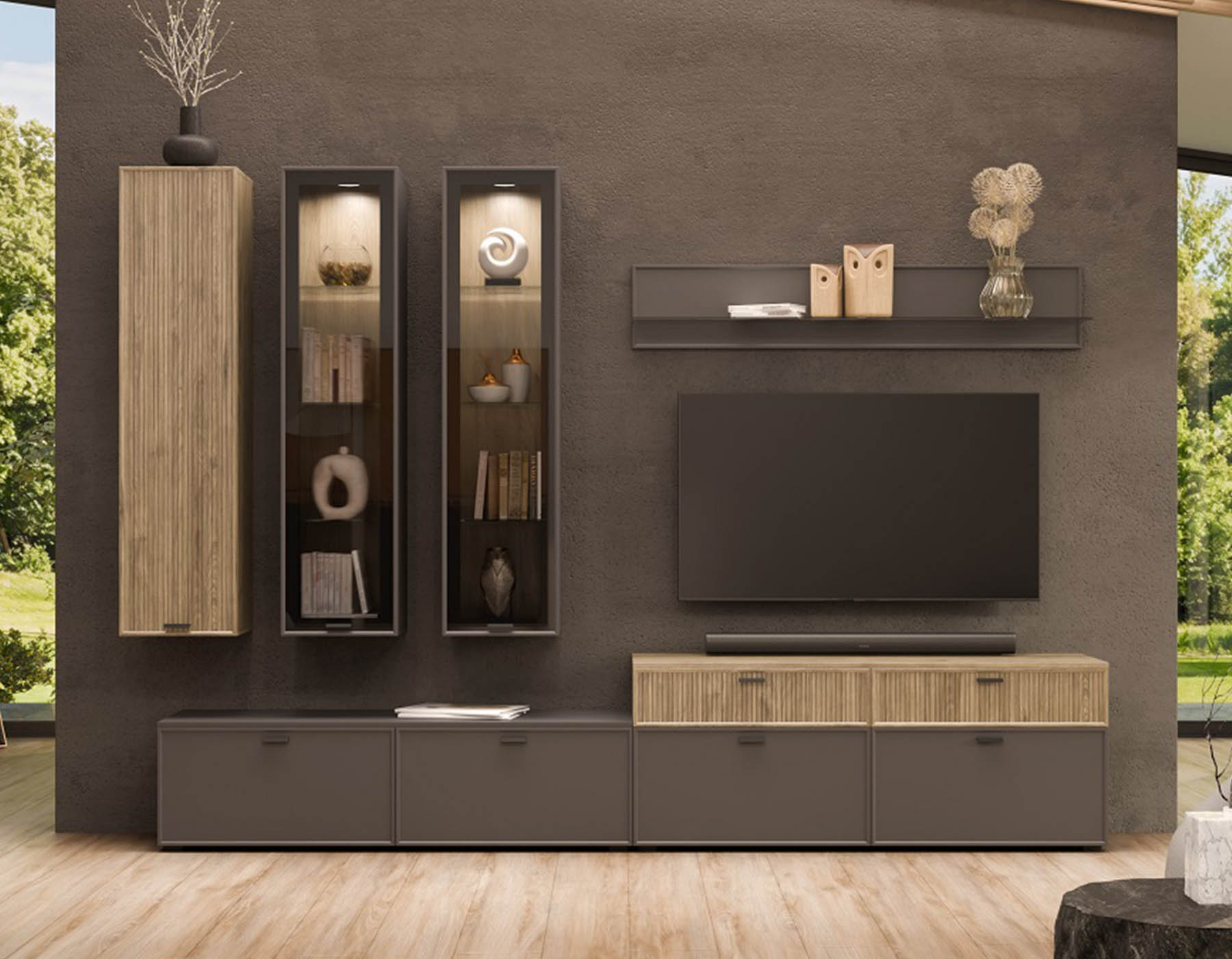 - Функциональность: шкафы-витрины, ТВ-тумба и полки для хранения и декора