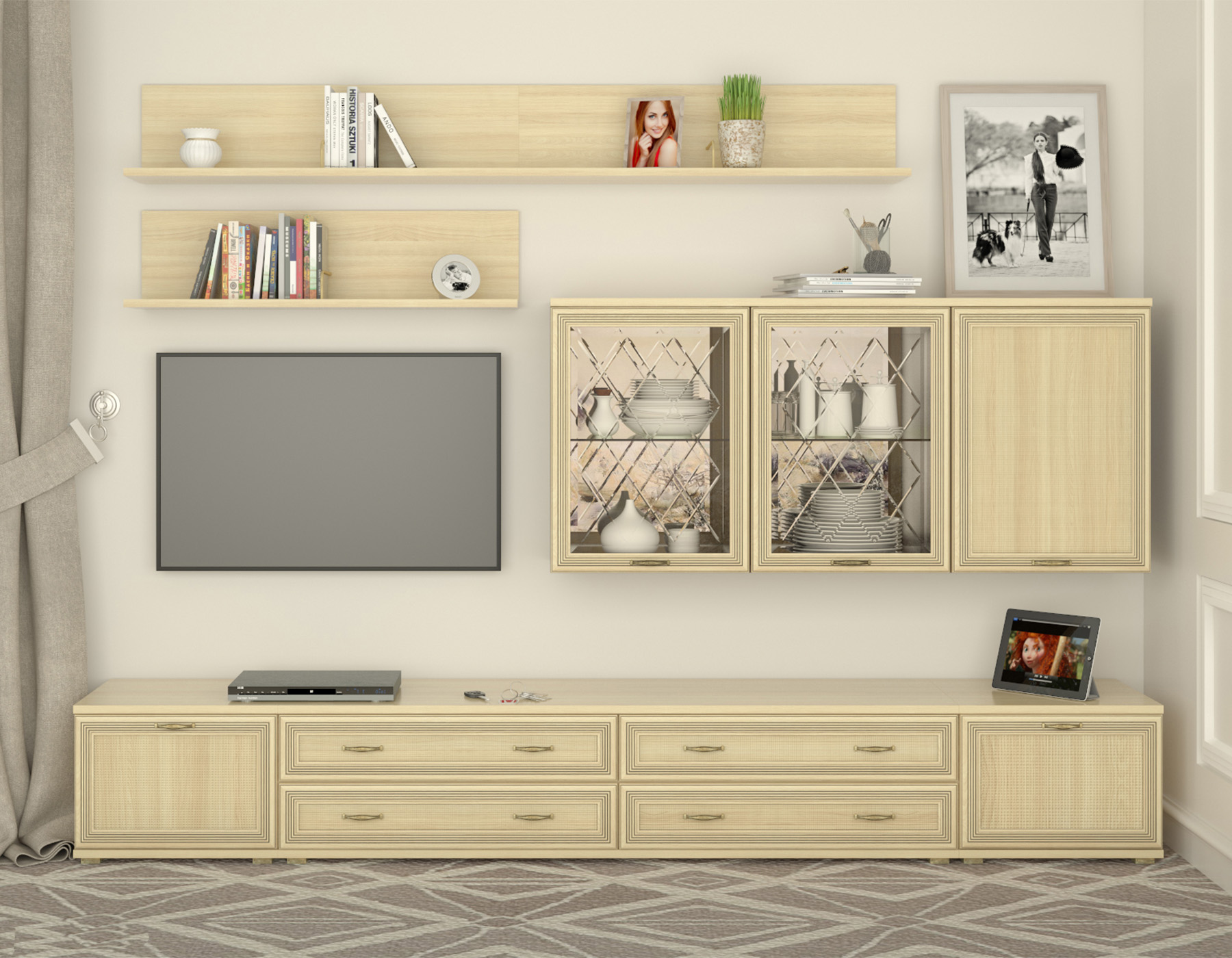 Стильный набор универсальных модулей гостиной разработан специально для нестандартных комнат. Ничего лишнего , только нужное и необходимое для жизни.