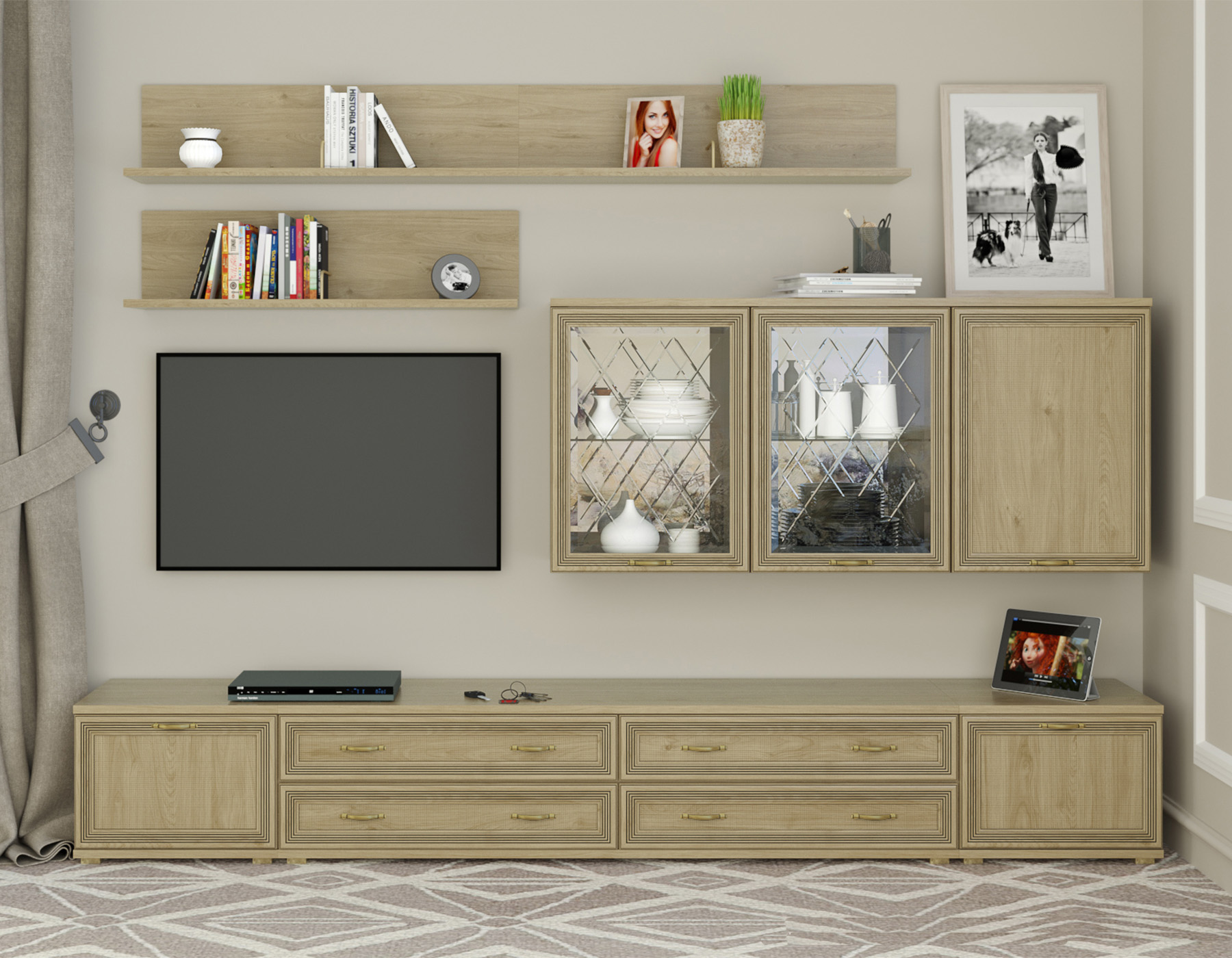 Стильный набор универсальных модулей гостиной разработан специально для нестандартных комнат. Ничего лишнего , только нужное и необходимое для жизни.
