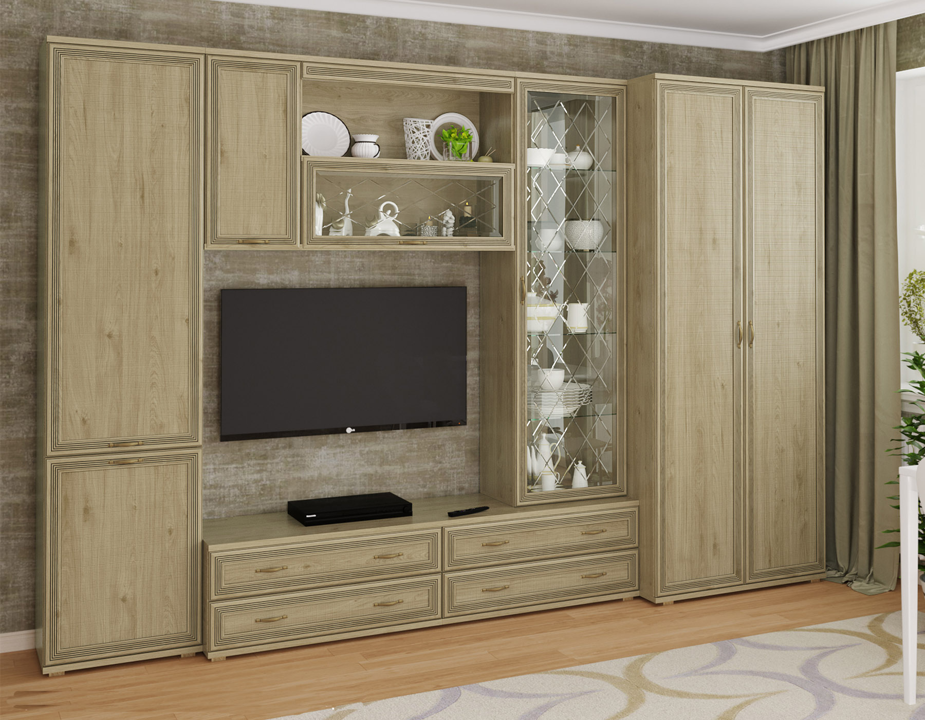 Стильный набор универсальных модулей гостиной разработан специально для нестандартных комнат. Ничего лишнего , только нужное и необходимое для жизни.