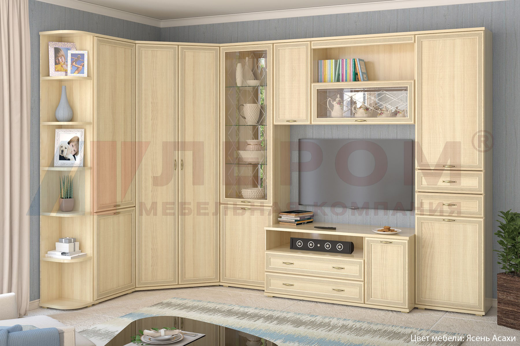 Стильный набор универсальных модулей гостиной разработан специально для нестандартных комнат. Ничего лишнего , только нужное и необходимое для жизни.