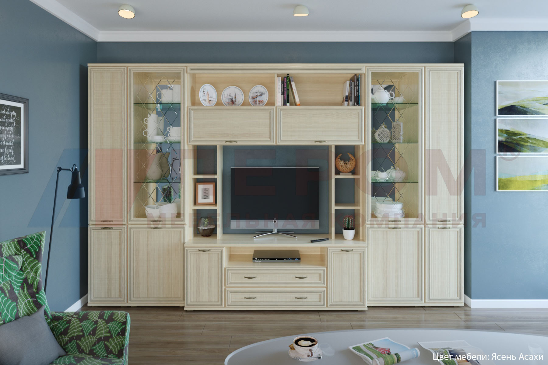 Внешний вид гостиной подчеркнут улучшенной, качественной фурнитурой с доводчиками- множество дверей и ящиков и никакого шума при закрывании.