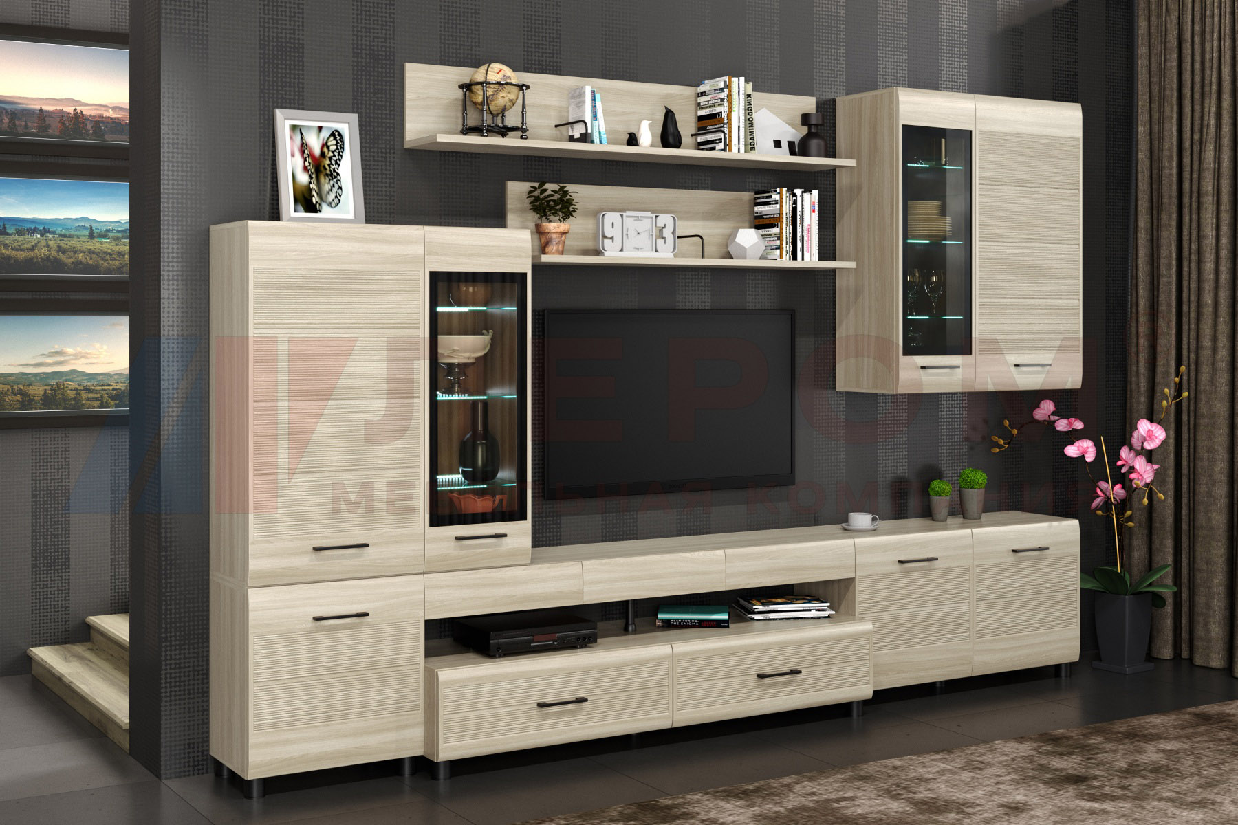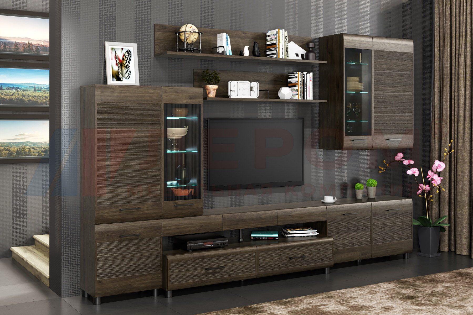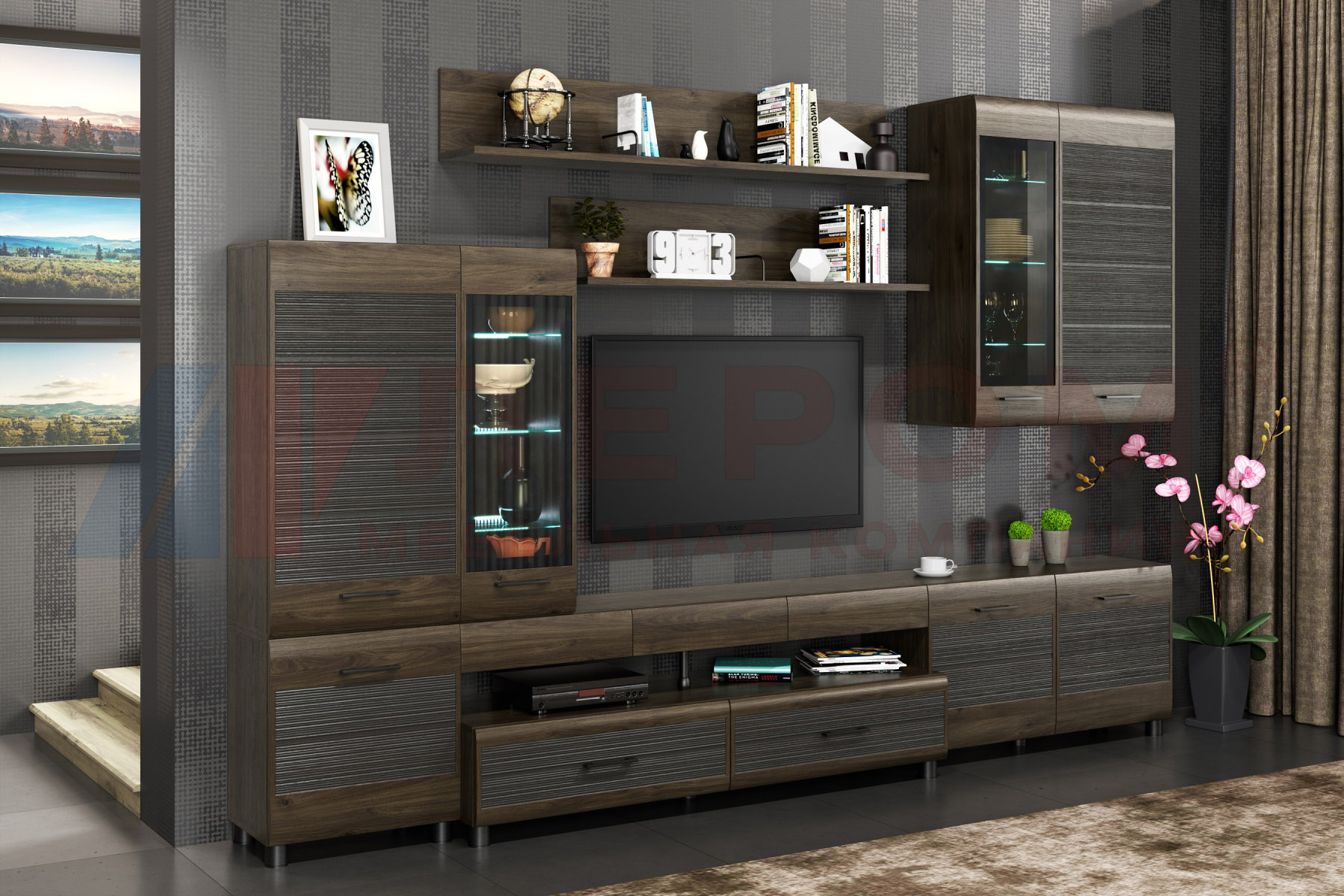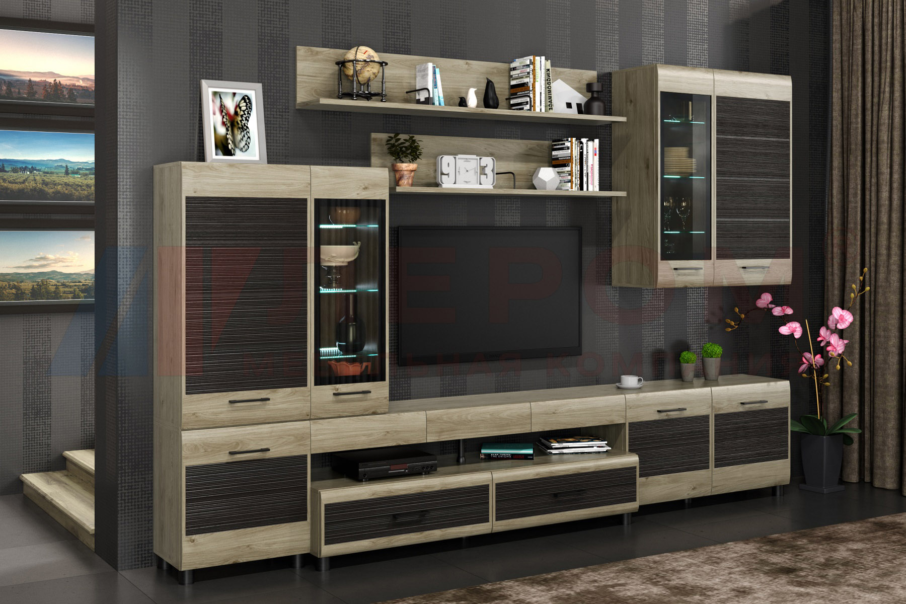 Корпусная мебель для гостиной "Камелия" - это модульная мебель. Фасады с комбинированными вставками имитируют специальную технологию "браширования". Мебель изготавливается из высококачественных материалов: ЛДСП, МДФ (фасад), стекло фасадов с оттенком "графит".