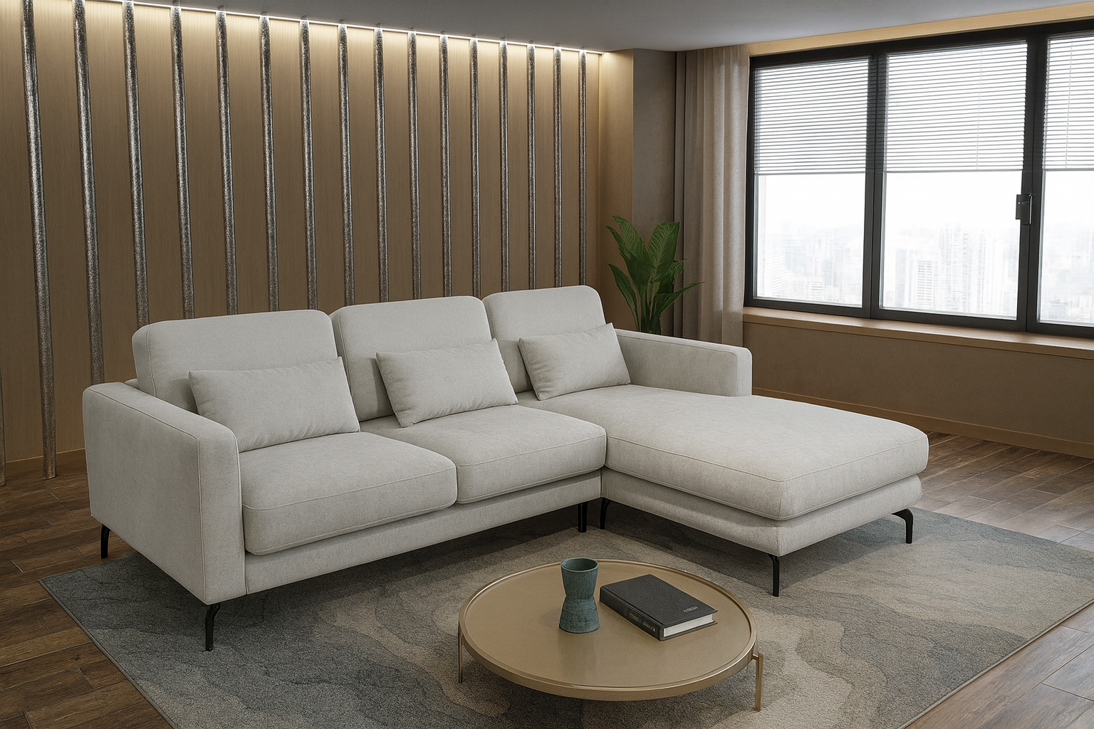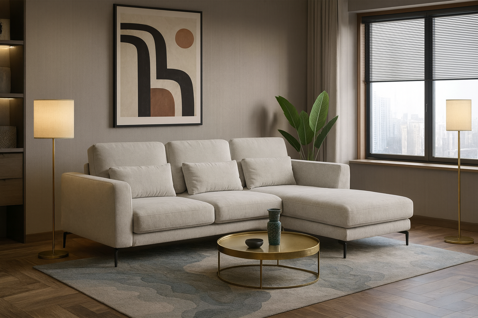 Разместите «К21» как центр зоны отдыха. Добавьте контрастные подушки, мягкий плед и журнальный столик из массива — и ваша гостиная наполнится светом и уютом. Светлые тона дивана идеально сочетаются с деревом, металлом и нейтральными стенами.