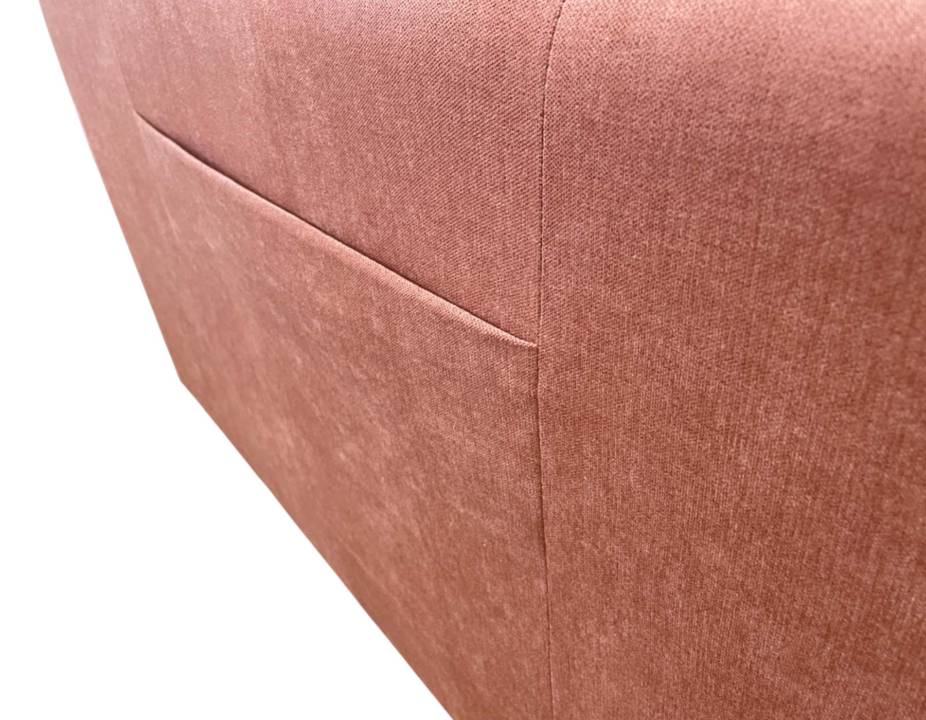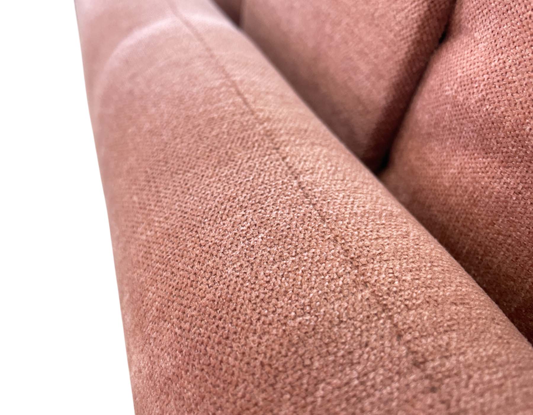 Персиковый цвет обивки придает дивану особую элегантность и теплоту, делая его центральным элементом интерьера. Стеганая поверхность сиденья и спинки добавляет изысканности и подчеркивает внимание к деталям. Минималистичные черные ножки создают легкий и современный образ, визуально увеличивая пространство вокруг дивана.