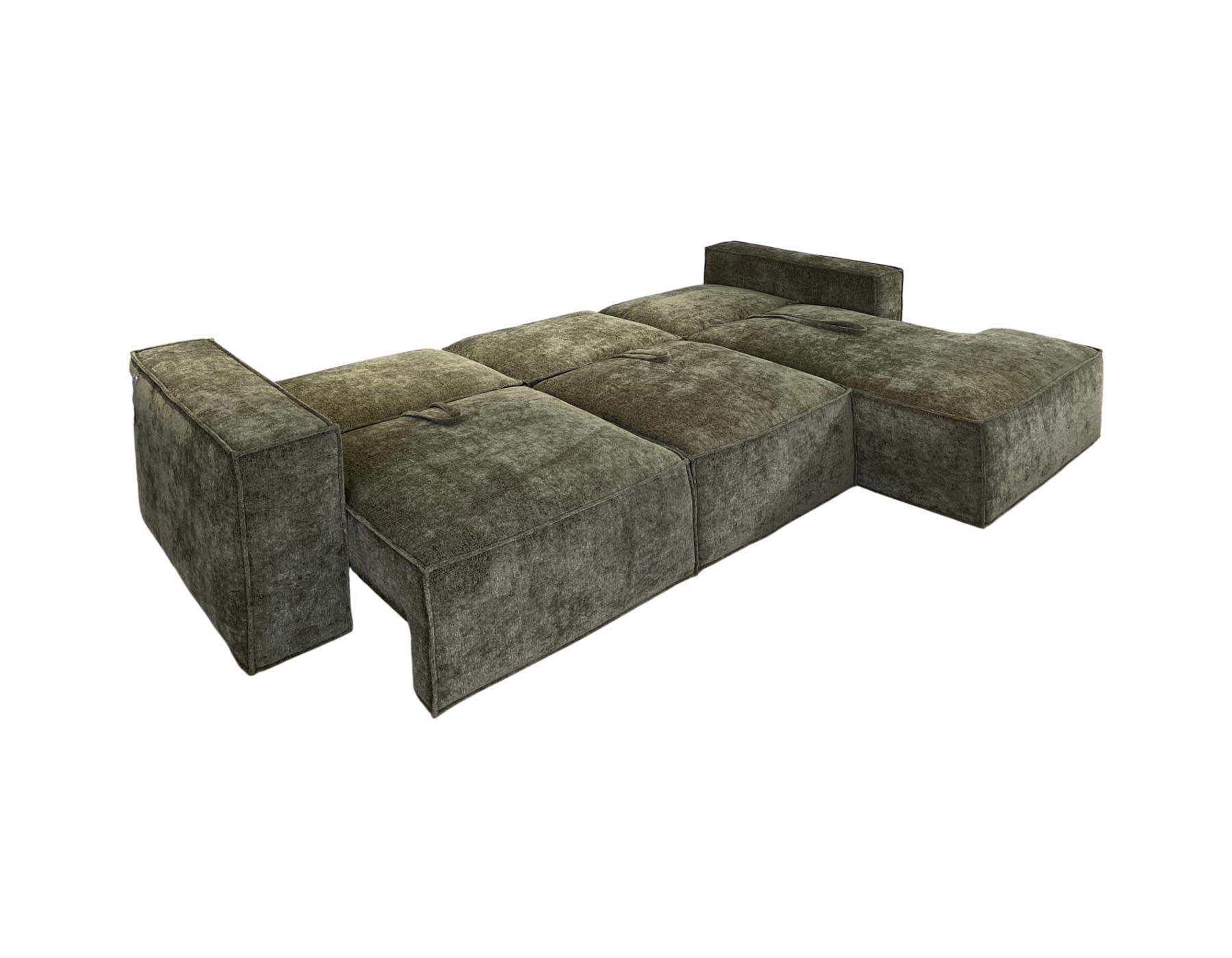 Обивка насыщенного зеленого цвета из мягкой и приятной ткани создает атмосферу уюта и комфорта. Модель отличается просторным угловым дизайном с широкими подлокотниками и удобными спинками, обеспечивающими максимальную поддержку и комфорт при отдыхе.