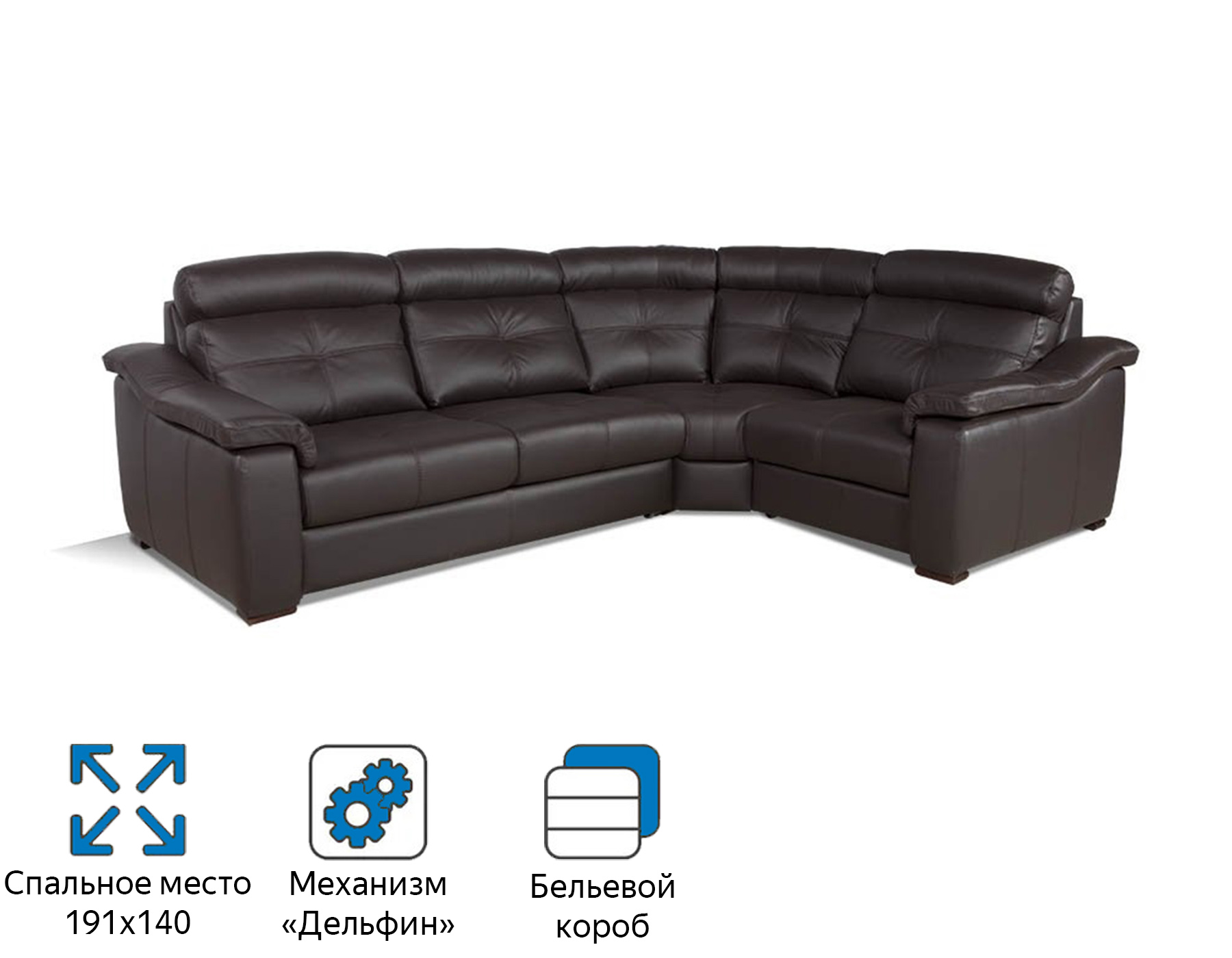 - Премиальный дизайн: Обивка из натуральной кожи глубокого шоколадного оттенка придает дивану роскошный вид.