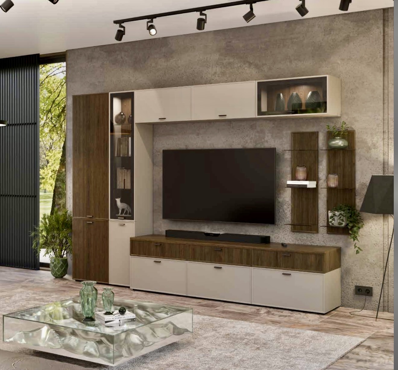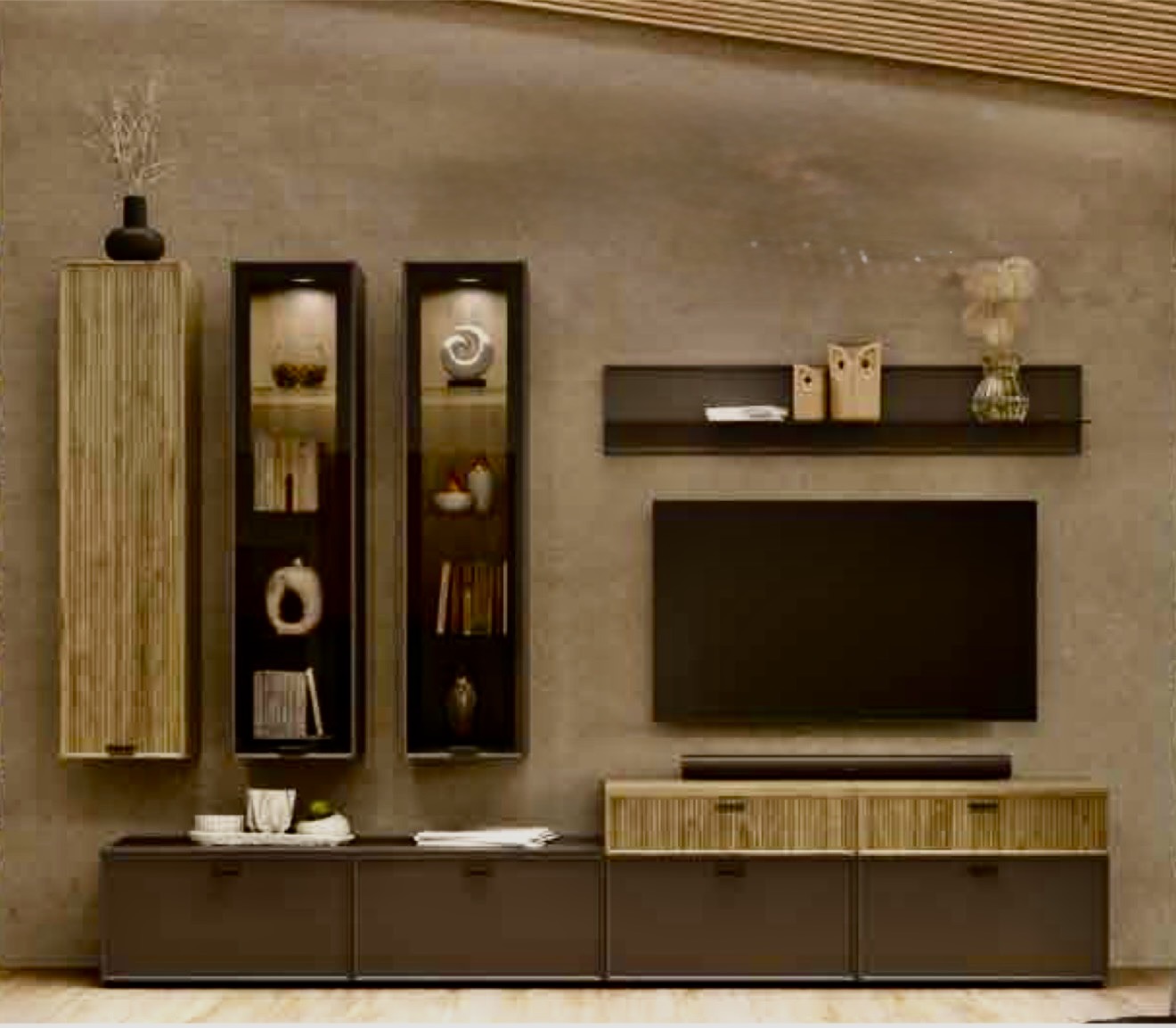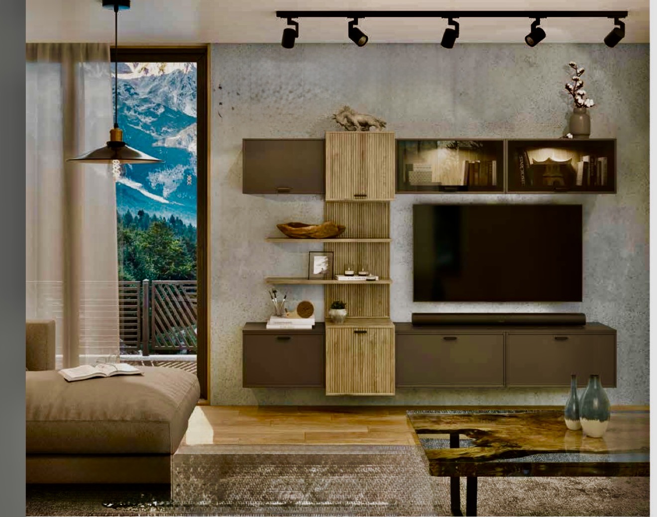 Тёплый кофейный оттенок и охристые акценты на фоне Серого Кашемира создают атмосферу природной элегантности — хорошее решение для гостиной и кабинета.
