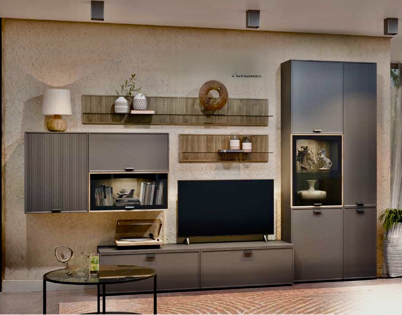- Мебель: фасады и корпус в базовом сером + тёплые вставки дерева/металла.